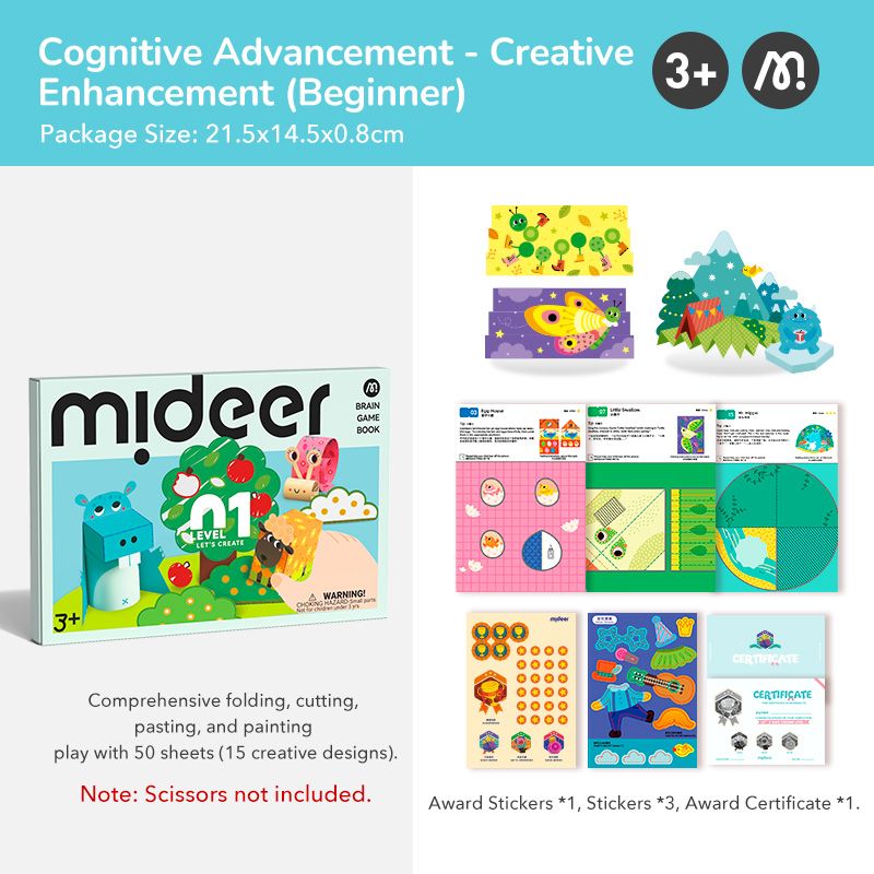An interactive creative set from the LEVEL UP series that guides children aged 3 and up through the world of folding, cutting, gluing, and coloring. Each sheet is a small artistic task—together with their parents, they can transform it into a beautiful creation.