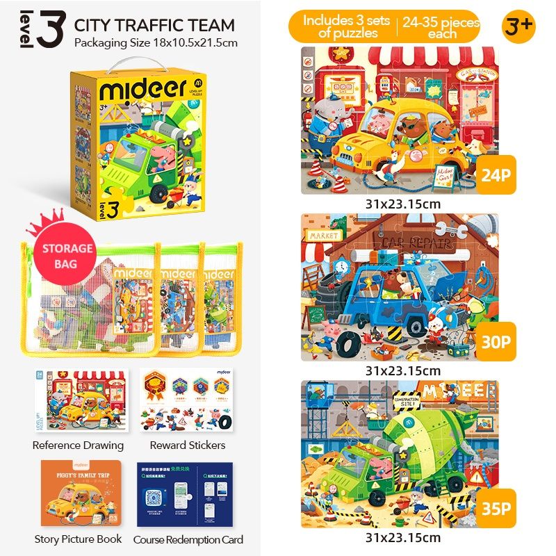 The puzzle contains a total of 3 puzzles (24, 30, and 35 pieces), including 3 zippered cases for storing the pieces for each puzzle.
