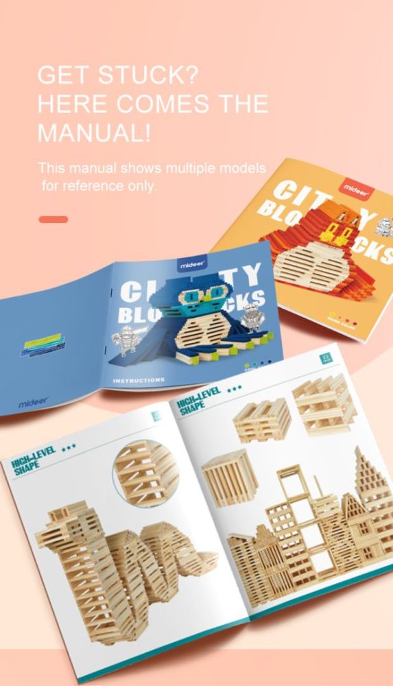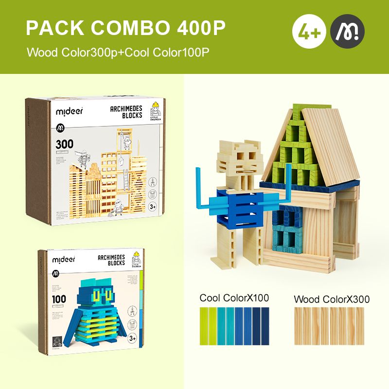 Sada obsahuje 400 pečlivě opracovaných dřevěných bloků v jednotném tvaru, což umožňuje stavět neomezené množství konstrukcí – od jednoduchých domečků přes lodě až po vysoké věže či celé městské scenérie.