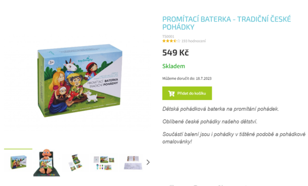 Thanks to our good relationships with people in China, we decided to have the first Toysimply products manufactured there. In cooperation with a Czech illustrator, we commissioned the production of Toysimply projector torches with purely Czech and Slovak fairy tales, including replacement discs for the torches. These products were manufactured during the summer and we launched them for sale at the beginning of October.