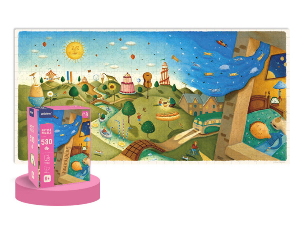 This art puzzle, once completed, displays the Dreamer design by artist Alison Jay. This renowned British artist paints images with a specific retro style, mysteriousness. The paintings depict children's fairy tales, which helps to develop children's imagination. Her work also incorporates motifs of animals, which she sees as part of our human life. Alison Jay is also famous for her children's book Welcome to the Zoo, which won the Best Book Award in 2009.
