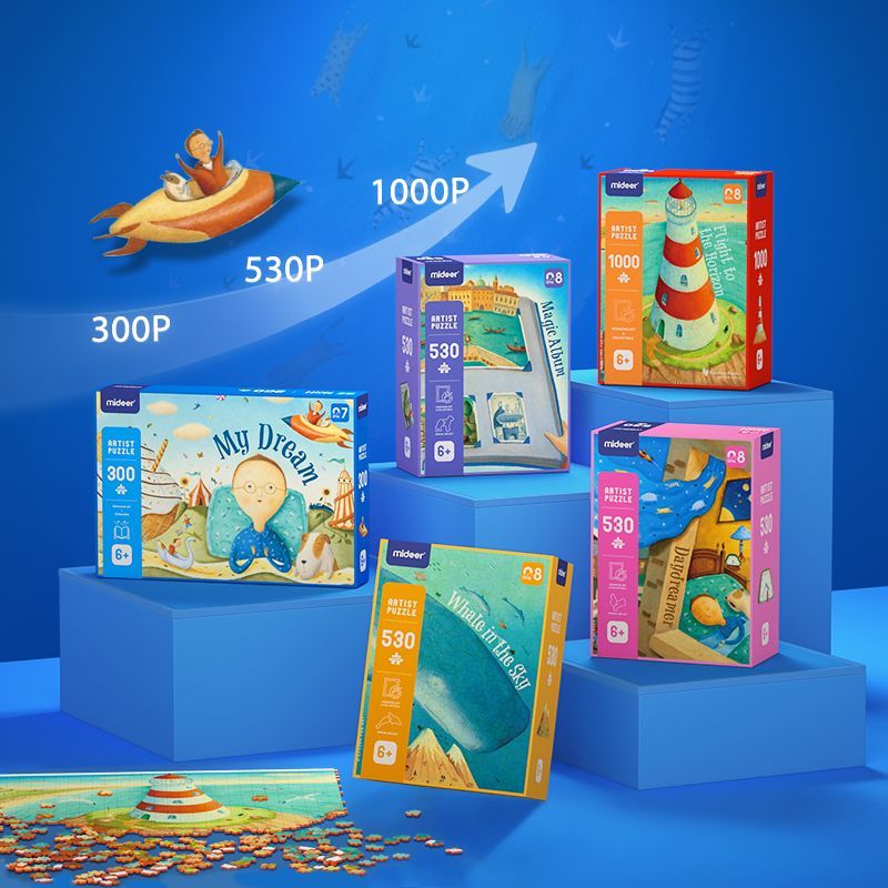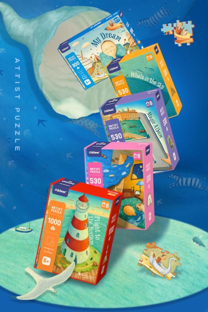 Toto umělecké puzzle po složení zobrazuje motiv Velryby na obloze dle předlohy od umělkyně Alison Jay. Tato renomovaná britská umělkyně maluje obrazy specifické retro stylem, tajemností. Obrazy vystihují dětské pohádky, což napomáhá k rozvoji dětské představivosti. Ve své tvorbě má zakomponované i motivy zvířátek, které vnímá jako součást našeho lidského života. Alison Jay se také proslavila knihou pro děti Vítejte v ZOO, která v roce 2009 získala ocenění za nejlepší knihu.