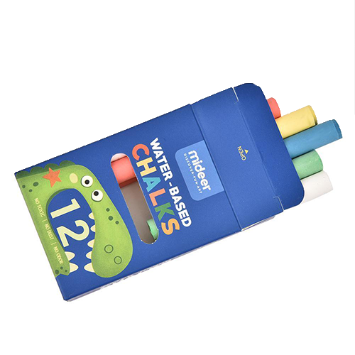 The box contains a total of 12 pieces of chalk. There are 5 colours in the box (green, blue, yellow, red) 2pcs each, white 4pcs.