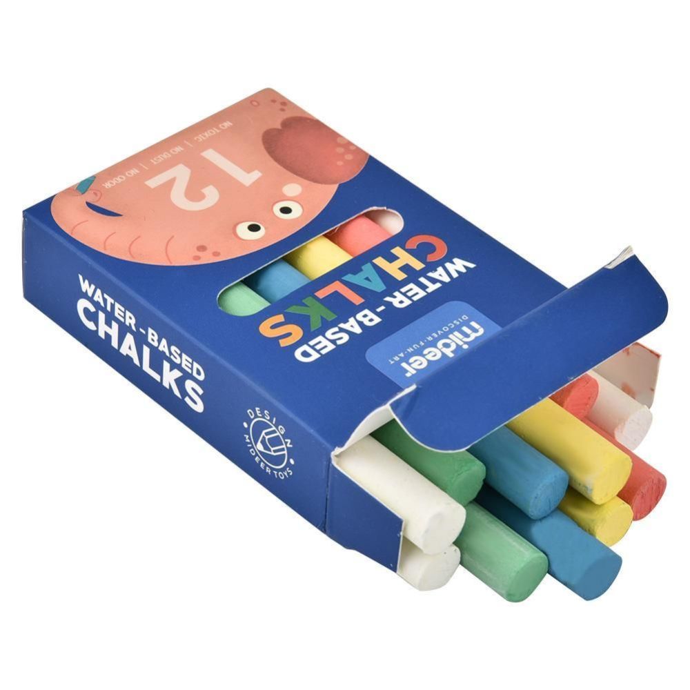 The box contains a total of 12 pieces of chalk. There are 5 colours in the box (green, blue, yellow, red) 2 pcs each, white 4 pcs.