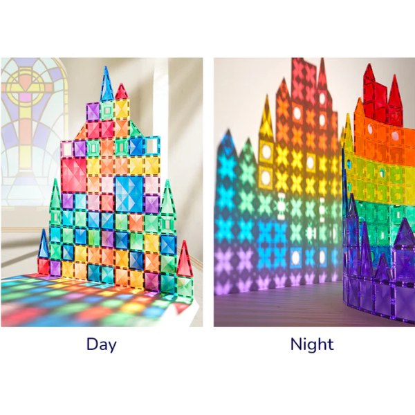 Thanks to colorful transparent pieces with built-in magnets, children can build houses, castles, bridges, towers, and many other shapes according to their imagination.