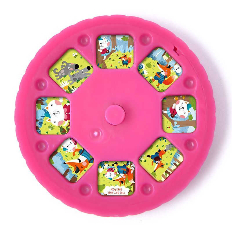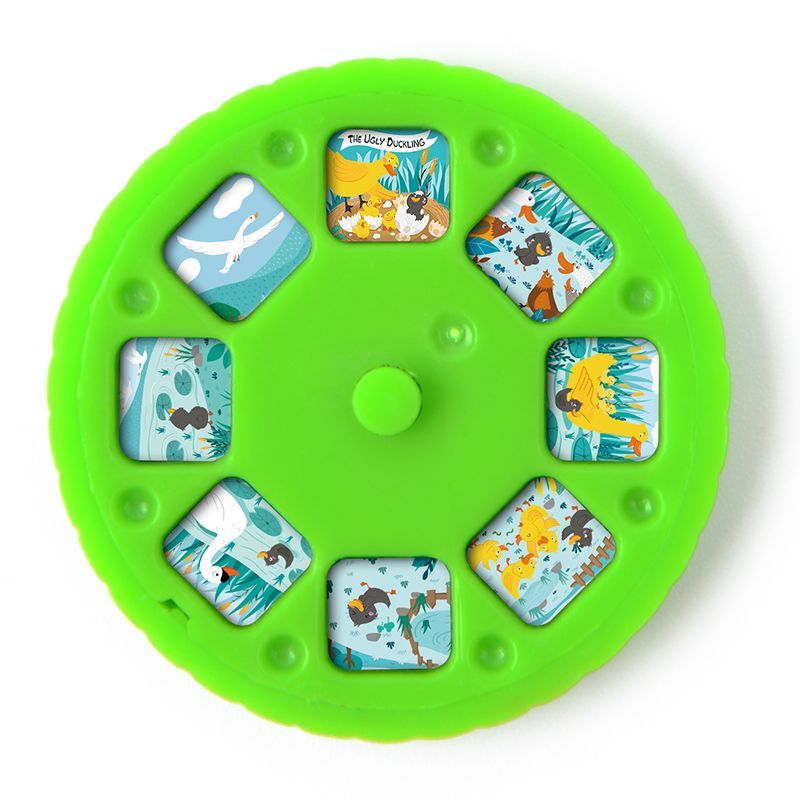 Turn off the light in the room, insert the disc into the flashlight and the storybook reading can begin.