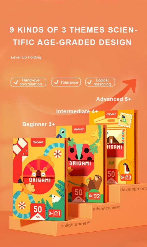 Kreatívna sada Mideer LEVEL UP obsahuje 3 úrovne skladania od jednoduchého po pokročilé.