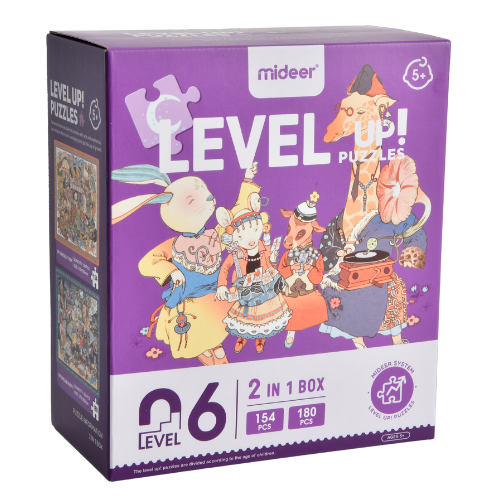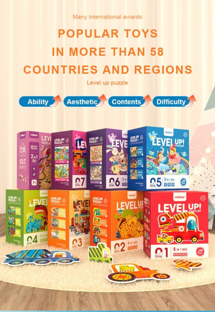 The advanced system of this puzzle is mainly manifested in three aspects. The number of pieces starts from 2 pieces and gradually increases up to 252 pieces. It also changes according to the complexity of the illustration from animal pictures to natural, urban and other scenes, and in the highest complexity to world geography, thus appropriately expanding the scope of children's cognition. Finally, the artistic rendering of the illustration has different levels.
