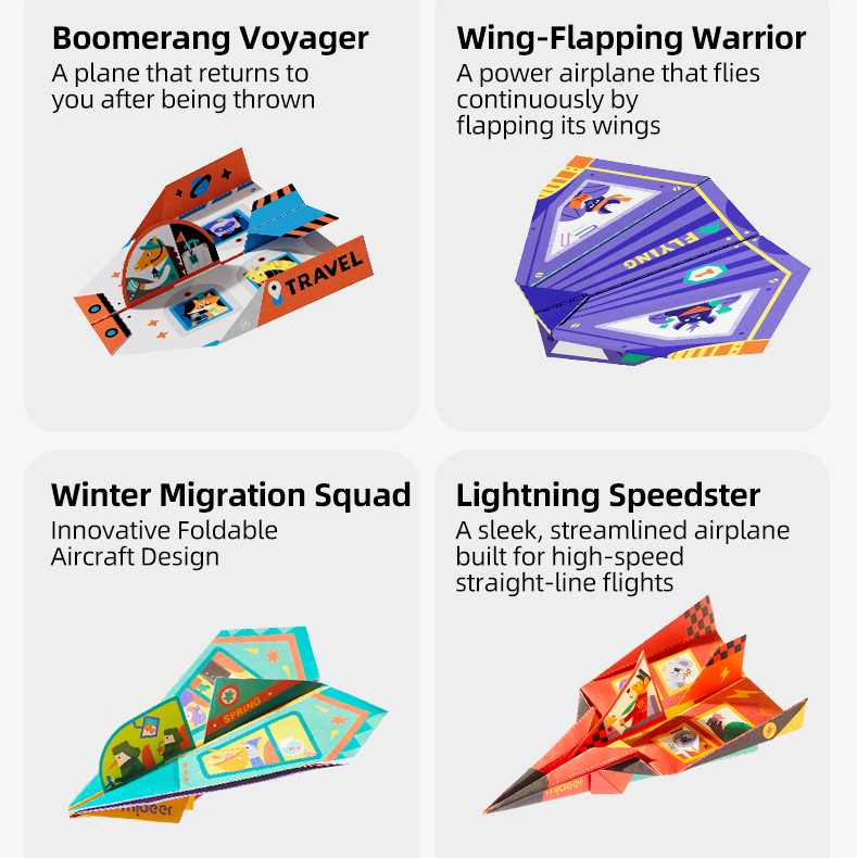 A papírmodellek a hagyományos japán origami művészetén alapulnak. A készlet négy különböző repülőt tartalmaz – Boomerang Voyager, Winged Warrior, Winter Migration Fleet és Lightning Speedster.