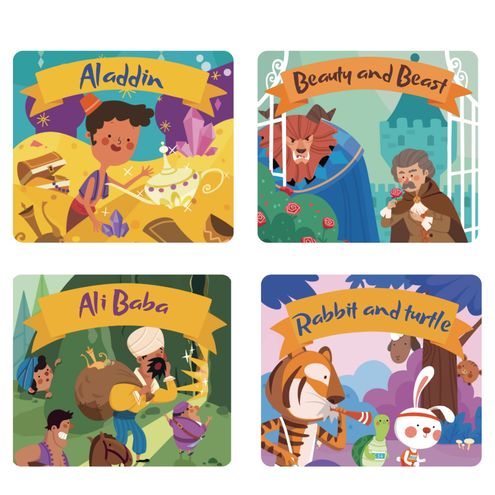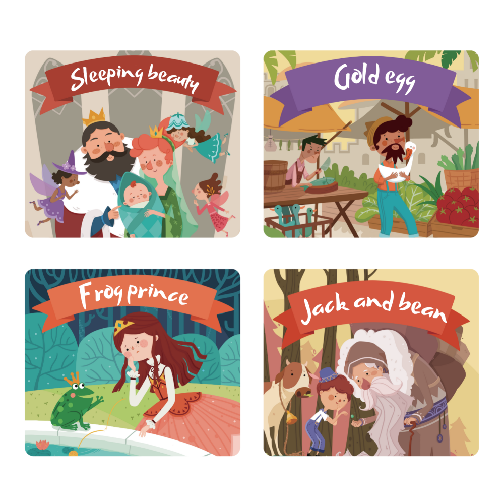 Das Paket enthält 4 Märchen: die drei kleinen Schweinchen, Rotkäppchen, der Fuchs und die Katze und das hässliche Entlein