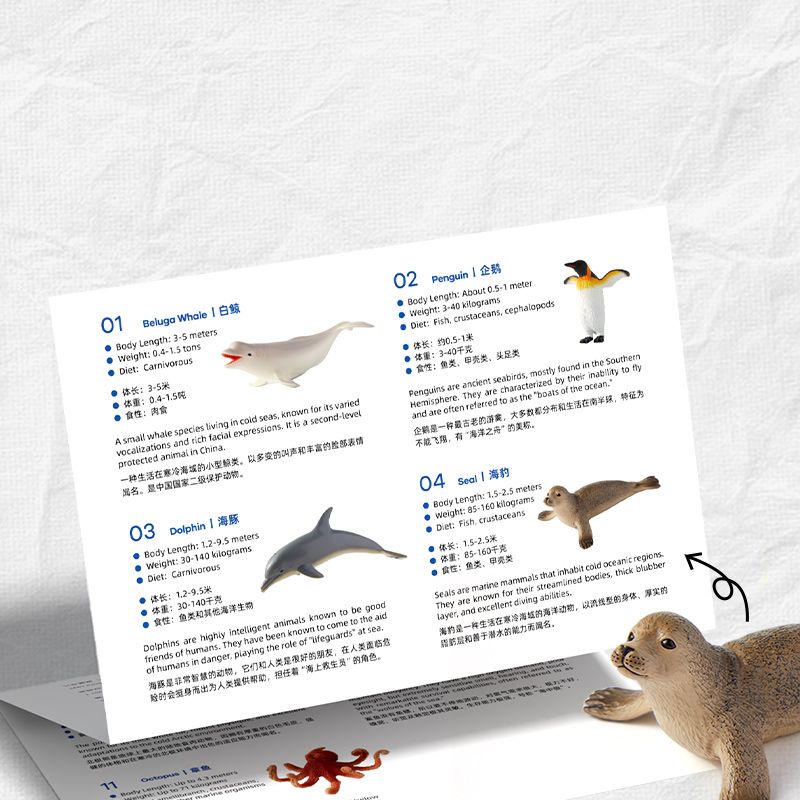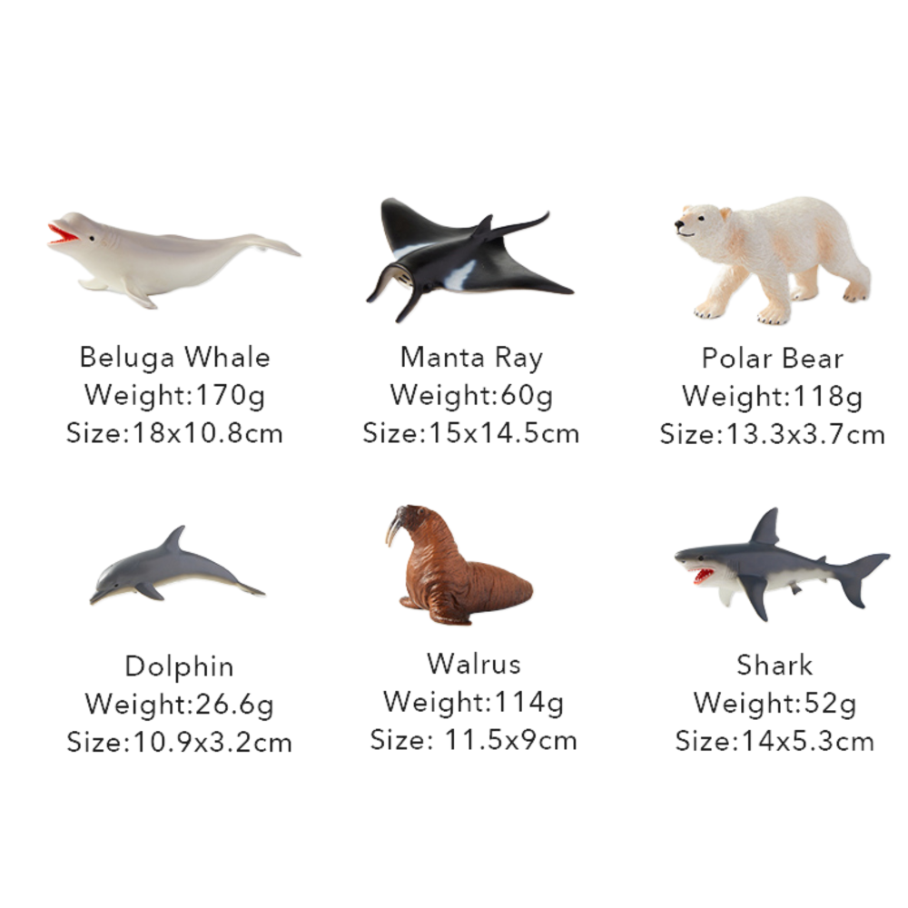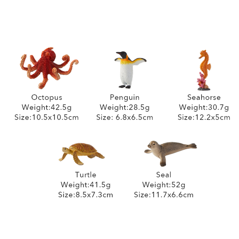 The set contains the following animals: walrus, whale, ray, polar bear, octopus, shark, dolphin, penguin, seahorse, turtle and seal.