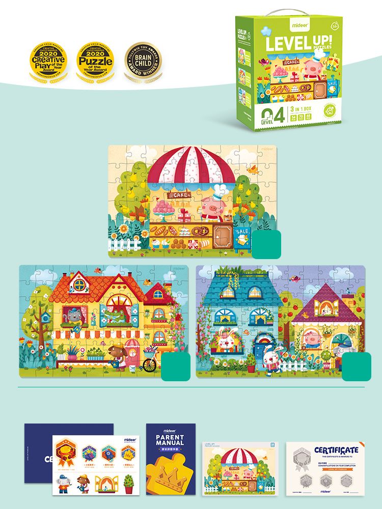 Pokročilý systém této skládačky se projevuje především ve třech aspektech. Za prvé, počet dílků začíná od 2 dílků a postupně se zvyšuje až na 330 dílků. Dále se mění dle složitosti ilustrace z obrázku zvířete na přírodní, městské a jiné výjevy a v nejvyšší složitosti na geografii světa, čímž se přiměřeně rozšiřuje rozsah dětského poznávání. A konečně i výtvarné ztvárnění ilustrace má různě úrovně.