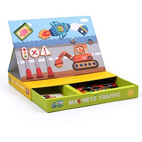 The game consists of a magnetic base with sky and road, 58 magnets and 8 pattern cards.