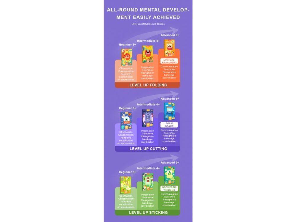• Precyzyjnie wycinać, składać i kleić, pomoże dziecku rozwinąć pomysłowość, artystyczne postrzeganie, umiejętności koordynacyjne i zwiększyć zdolność koncentracji