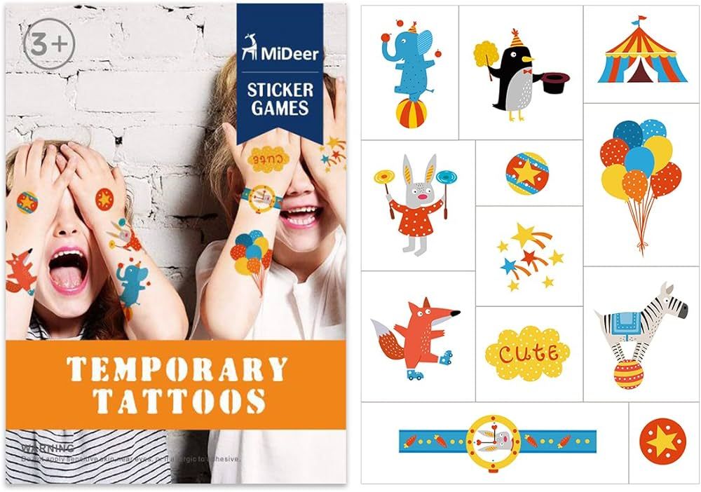 The set contains a total of 12 different tattoos of various sizes with a circus theme.