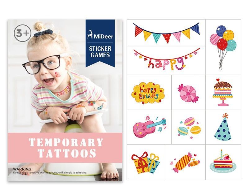 Zestaw zawiera łącznie 12 różnych tatuaży o różnej wielkości z motywem Urodziny.