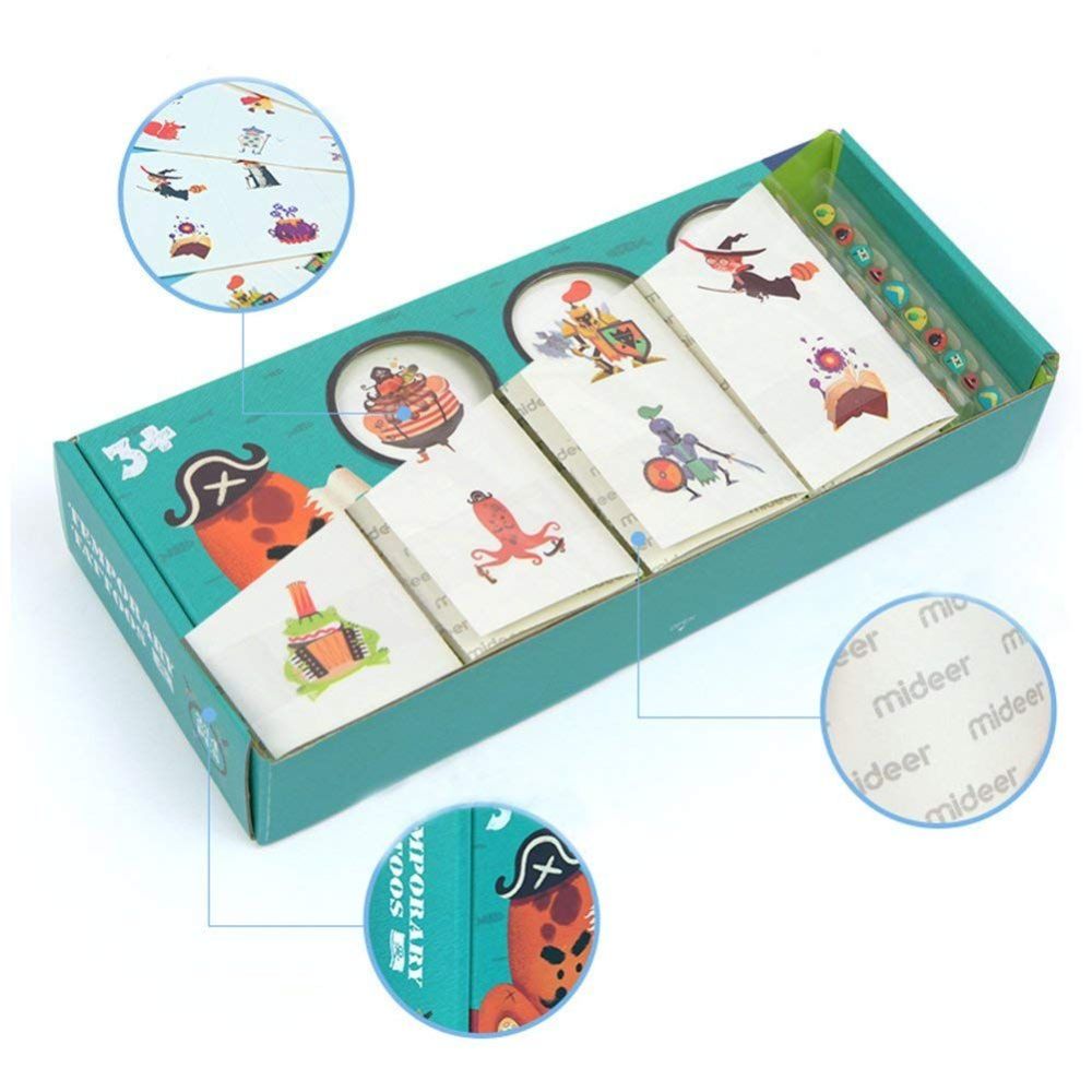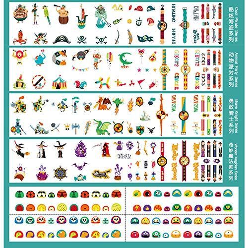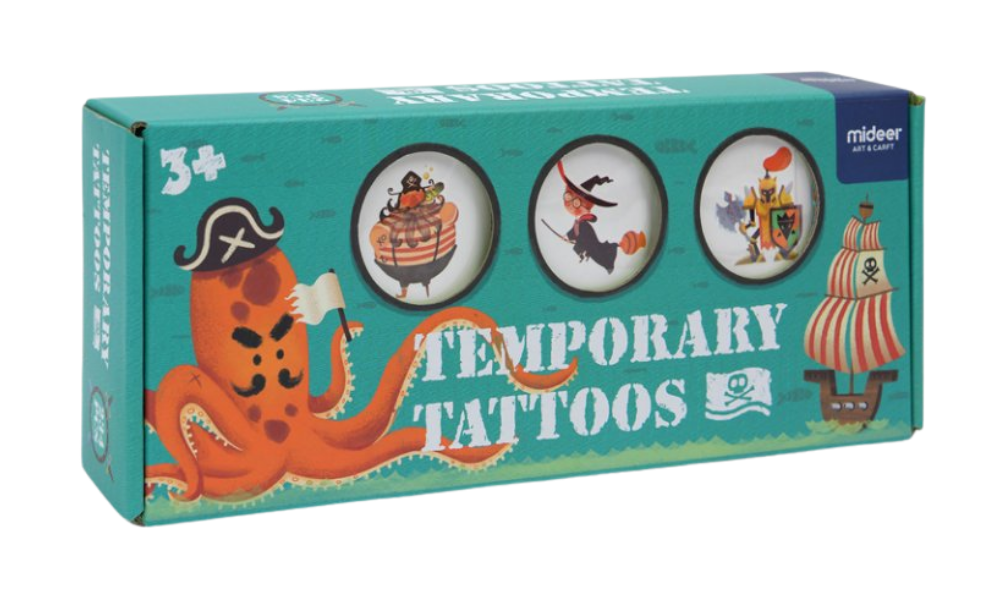 Das Set enthält insgesamt 253 verschiedene Tattoos. Das Set enthält Tattoos mit verschiedenen Themen, wie z.B. Piraten, Tiere, Ritter oder auch einen Zauberer.