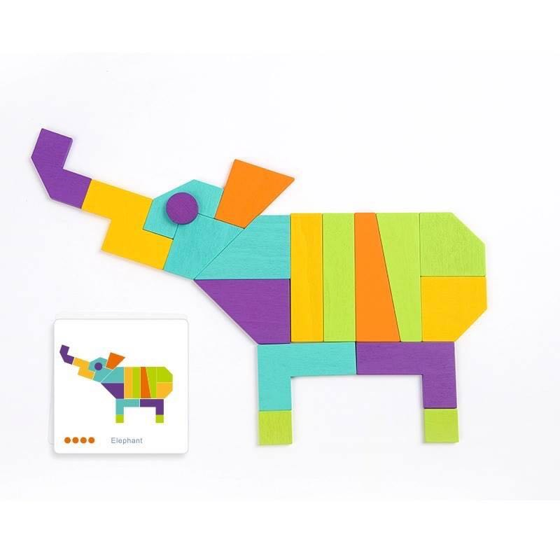 Das Puzzle enthält insgesamt 20 Vorlagen mit verschiedenen Bildern und 21 geometrische Holzformen.