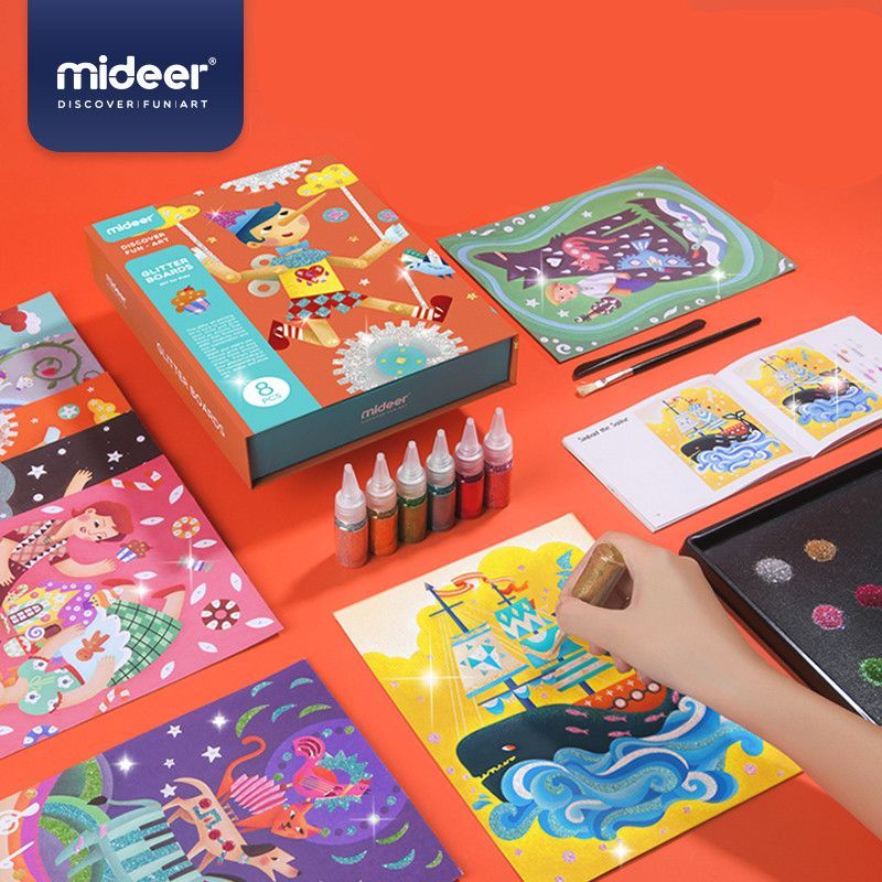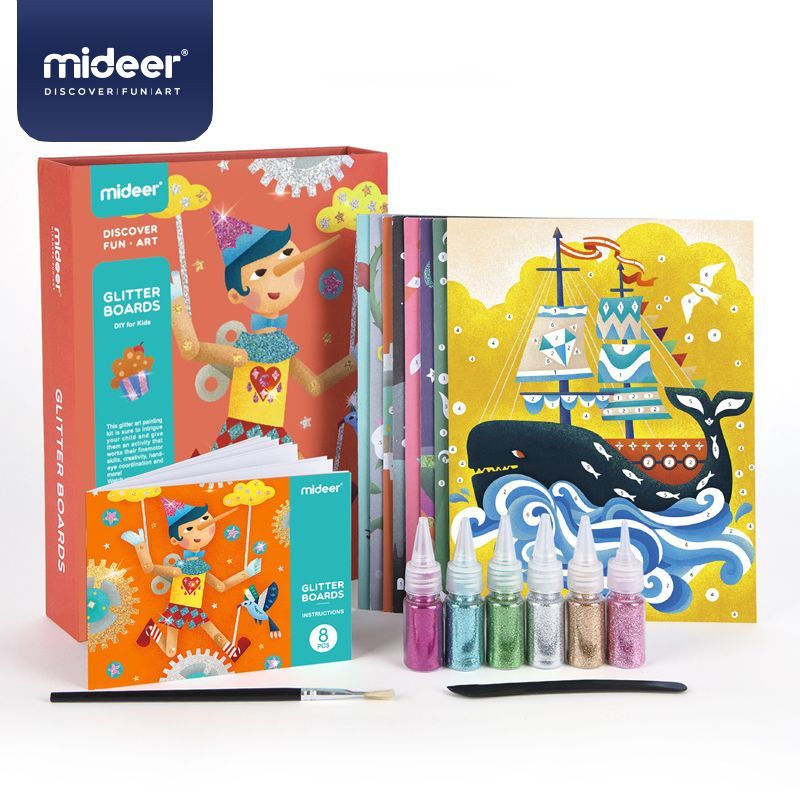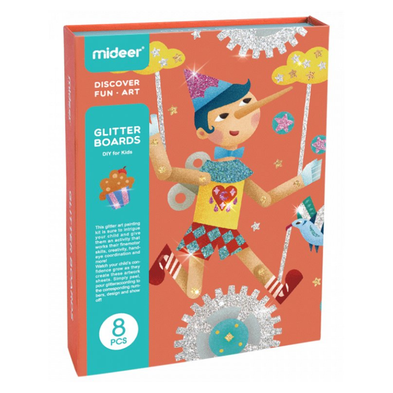 V balení naleznete 8 ks obrázků, krabičku, 6 druhů třpytek , špachtli na seškrabávání a štěteček.