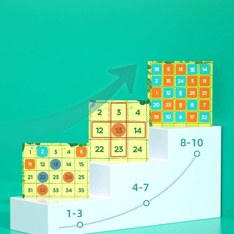 Balení obsahuje jednu velkou oboustrannou desku, sadu číselných čtverečků, sadu matematických znamének, dvě desetihranné kostky, 36 kusů magnetického tetris, 100 ks kulatých žetonků a lehce smývatelnou fixu.