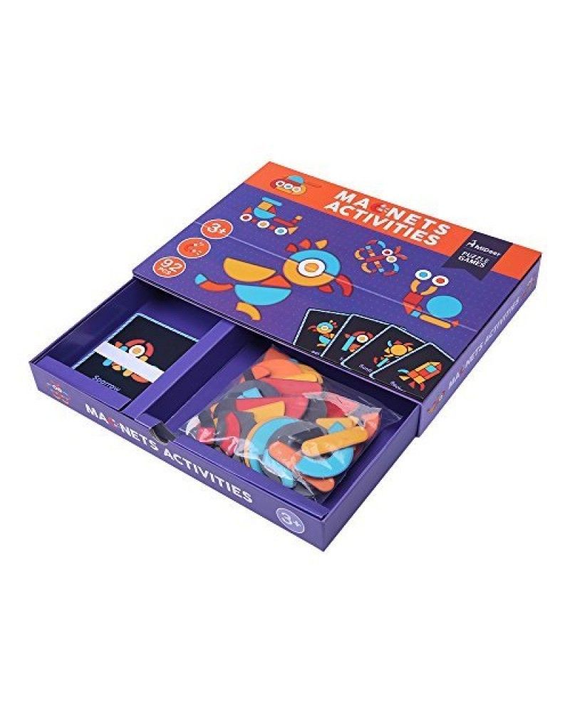 The game contains 92 individual pieces, a magnetic board and 10 sample cards.