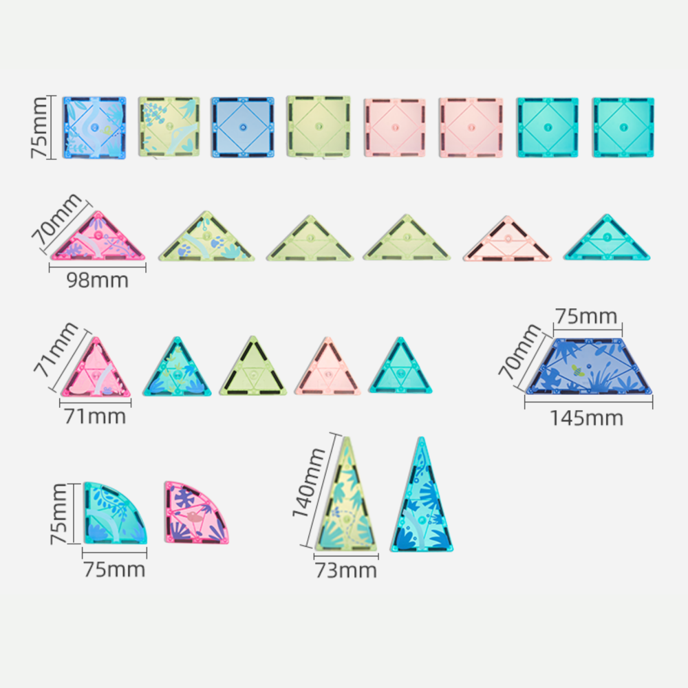 Duże elementy 7,5 x 7,5 cm – kwadrat, 7,1 x 7,1 cm trójkąt równoboczny, 7 x 9,8 cm trójkąt równoramienny, 7,5 x 7,5 cm kąt 90°, 14 x 7,3 cm duży trójkąt, 14,5 x 7,5 x 7 cm