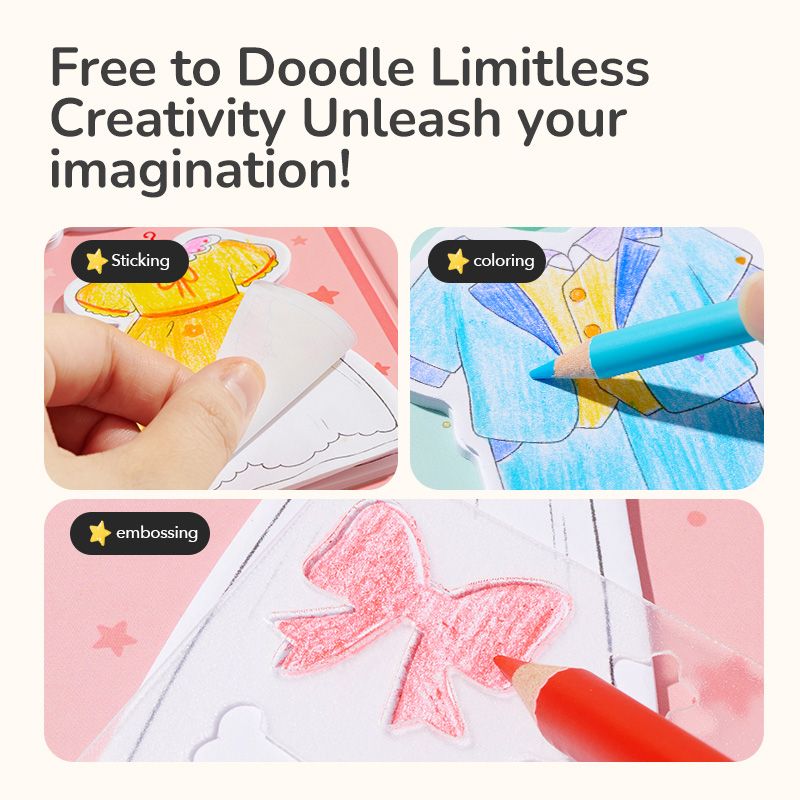 Děti si pomocí samolepek a barevných tužek mohou vytvářet vlastní módní kolekce, zdobit šaty, kombinovat oblečky a vytvářet nové outfity.
