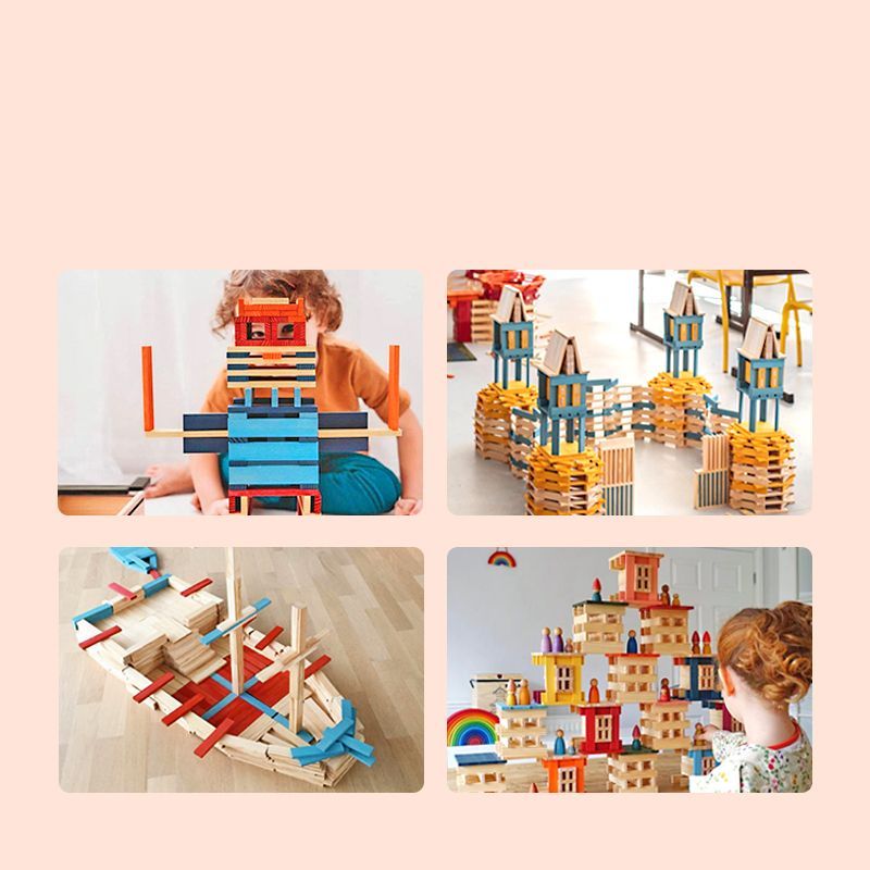 Sada obsahuje 400 pečlivě opracovaných dřevěných bloků v jednotném tvaru, což umožňuje stavět neomezené množství konstrukcí – od jednoduchých domečků přes lodě až po vysoké věže či celé městské scenérie.