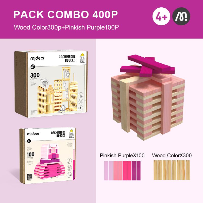 Sada OBSAHUJE celkom 300 drevených kociek v prírodnej farbe a 100 drevených kociek v ružových farbách na stavanie.
