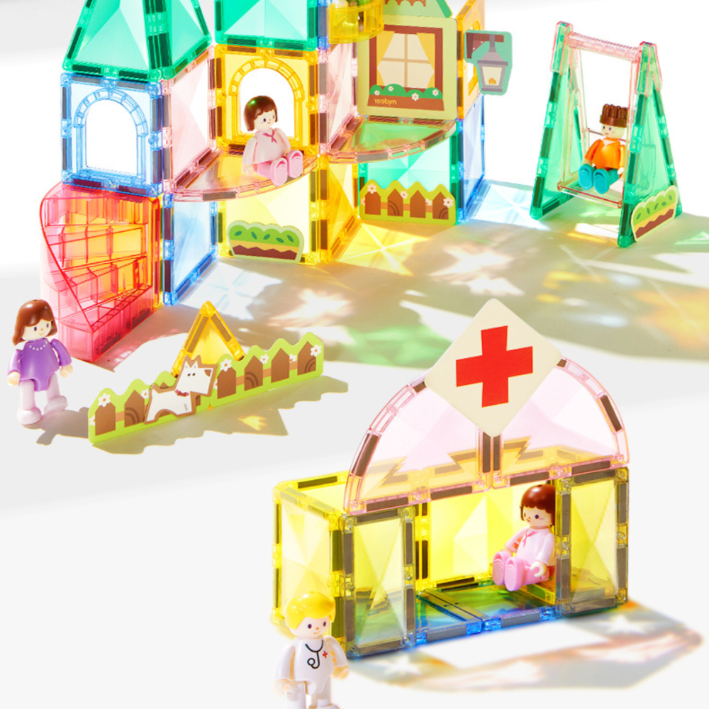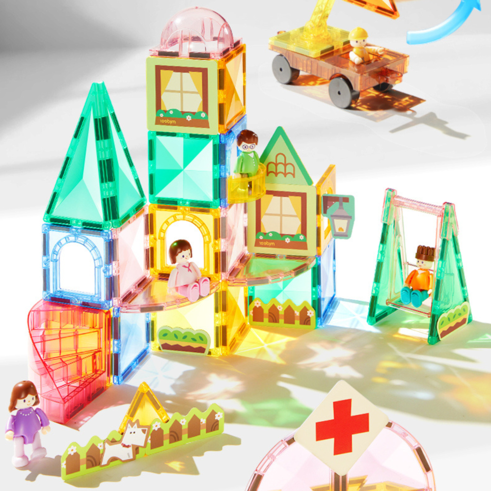 Children can let their imagination run wild and create 2D and 3D structures. This original magnetic building set for children also includes figurines, allowing little builders to create their own scenes from family life.