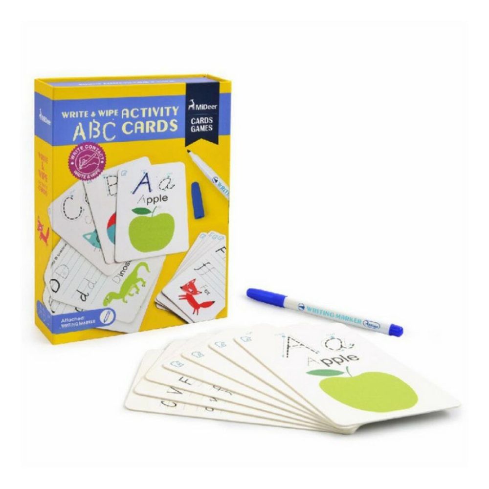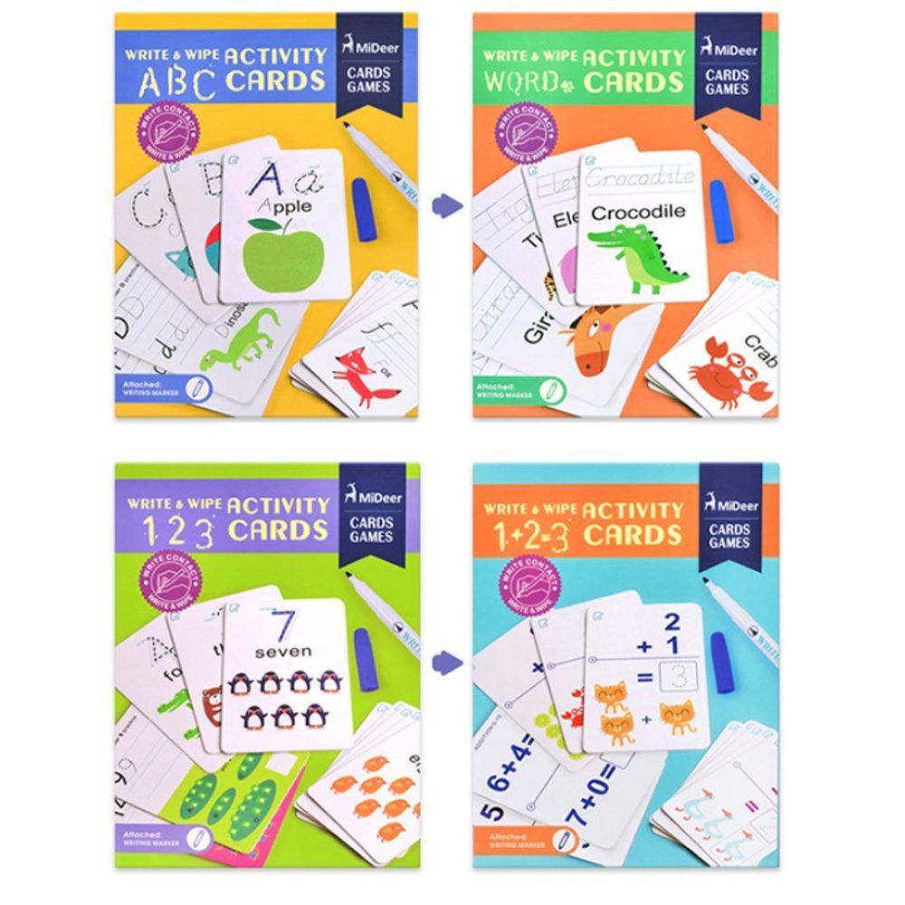 Každá karta je opatřena opakovaně použitelným povrchem, takže děti si mohou snadno procvičit své znalosti, kartu otřít a začít znovu.