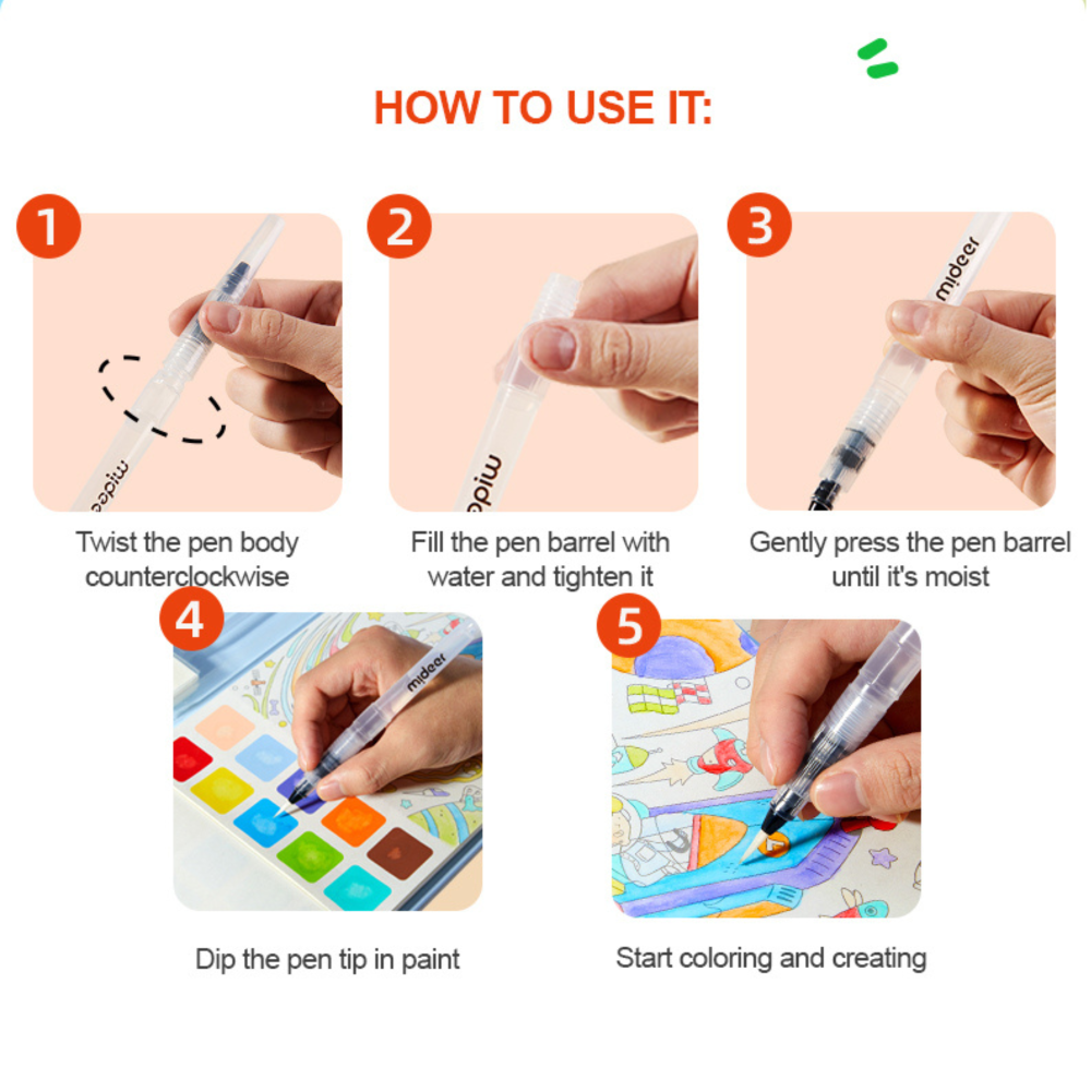 • Špeciálne pero - toto pero sa pred začatím maľovania naplní vodou, viac informácií nájdete na prvej strane knihy. Výhodou tohto pera je, že môžete ľahko dosiahnuť plynulé prechody farieb a vytvoriť úžasné majstrovské diela.