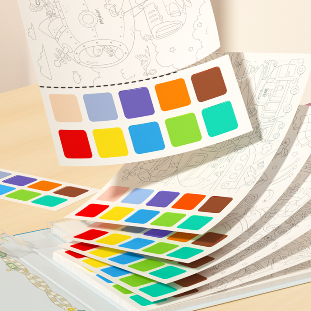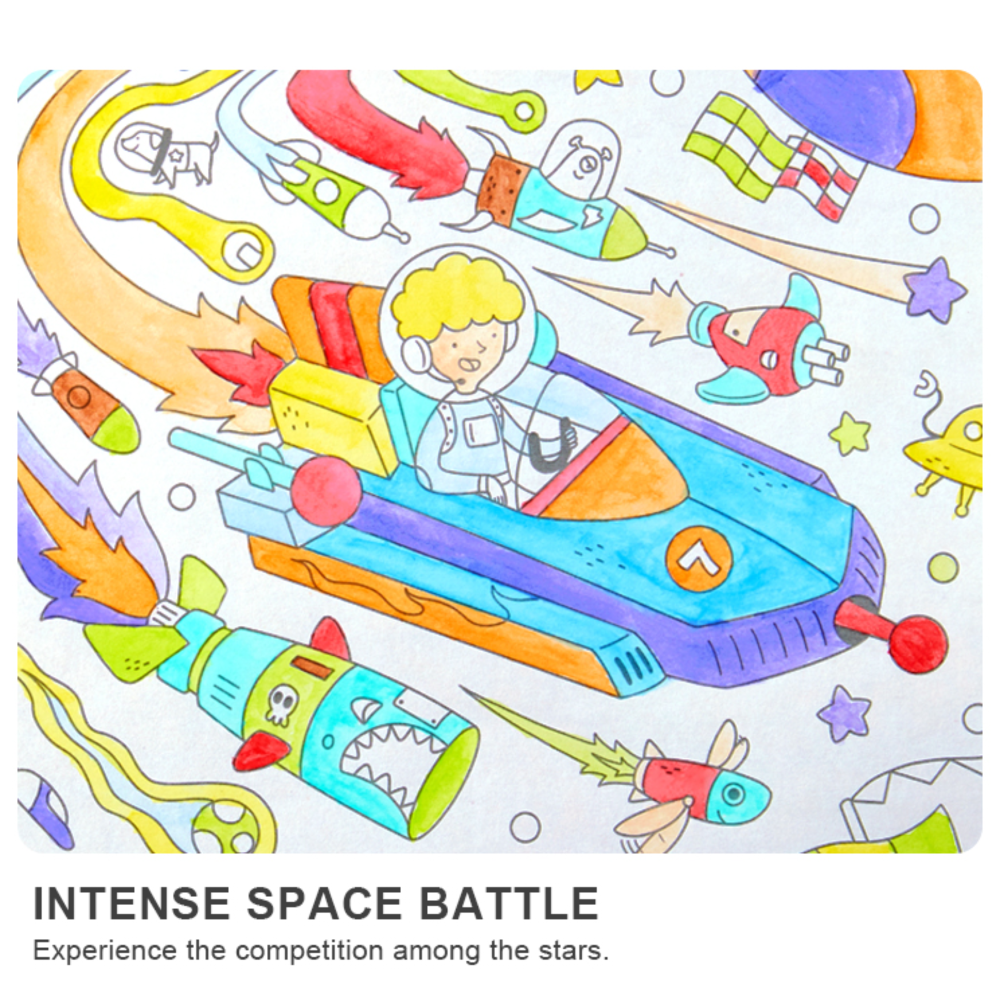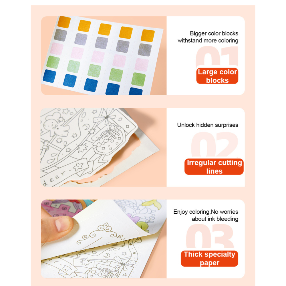 • 20 strán s námetmi na vyfarbenie, pričom každá strana obsahuje vlastnú sadu 10 rôznych farieb. A keď skončíte, vďaka perforácii je možné stránku odtrhnúť. A druhá strana omaľovánky je pripravená na to, aby ste mohli svoje dielo poslať priateľom ako pohľadnicu.