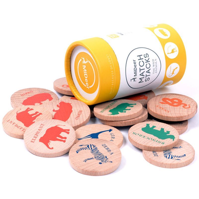 Rustikální dřevěné pexeso s barevným potiskem divokých zvířat.