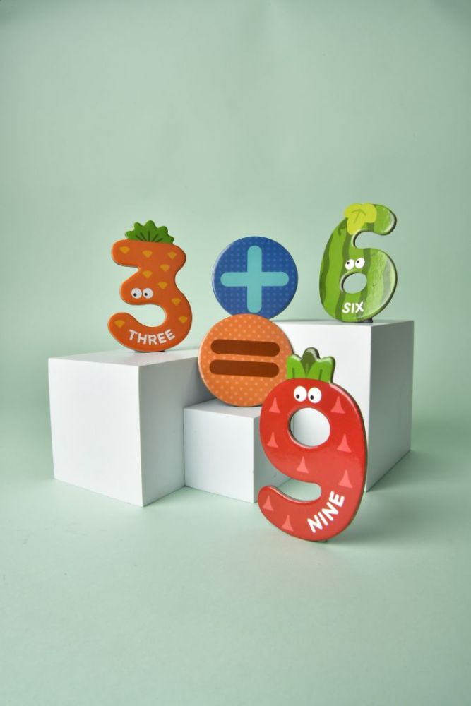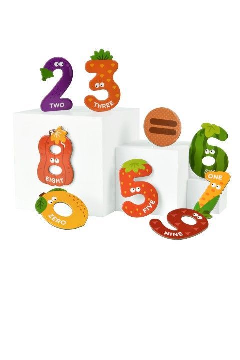 Magnetyczne cyfry z motywem owoców i warzyw.